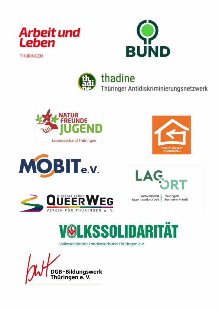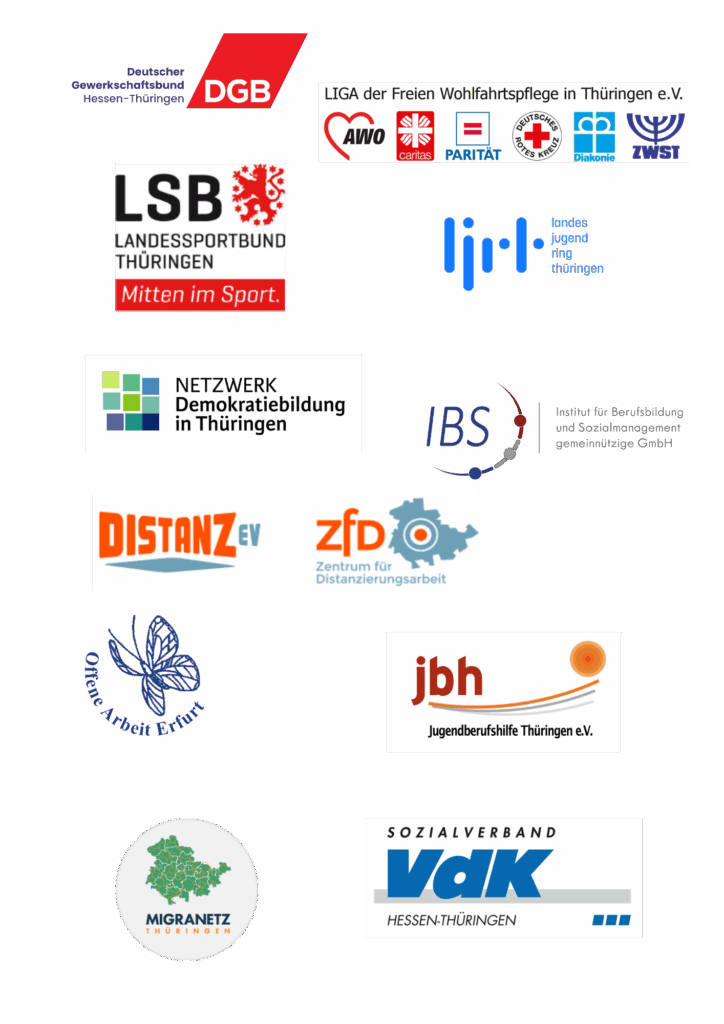 DGB Hessen-Thüringen | Liga der freien Wohlfahrtspflege Thüringen | Landessportbund Thüringen | Landesjugendring Thüringen | Jugendberufshilfe Thüringen | Netzwerk Demokratiebildung in Thüringen | IBS Institut für Berufsbildung und Sozialmanagement gGmbH | Distanz e.V. | Offene Arbeit Erfurt | Arbeit und Leben Thüringen | VDK Hessen Thüringen | Mobit e.V. | QueerWeg Verein für Thüringen | Flüchtlingsrat Thüringen | DGB-Bildungswerk Thüringen | Migranetz Thüringen | BUND Thüringnen | Thadine Thüringer Antidiskriminierungsnetzwerk | Volkssolidarität Thüringen | LAG ÖRT (Landesarbeitsgemeinschaft der örtlich-regionalen Träger der Jugendsozialarbeit | Naturfreundejugend Thüringen
